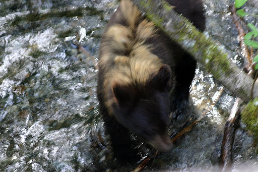 有鱼就会有熊,在这种地方再笨的熊都能轻易抓到鱼,熊掌朝浅溪中的鱼一拍就得手了,由于来得太容易,那么大的鱼,熊吃一口就扔了,然后再去拍别的鱼。狗熊掰棒子的精神在拍鱼运动中体现得淋漓尽致。
