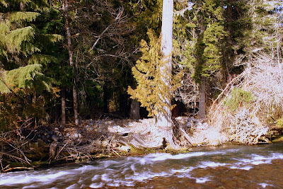 麦瑞河汊餐馆 Marion Forks Restaurant 是我喜欢的风景餐馆之一,餐馆位于蔚蓝美特国家森林之中。如果你从蔚蓝美特河谷Willamette Valley翻过喀斯科特山脉Cascades Range的三甜山口Santiam Pass去中澳瑞港高原,那么这里就是必经之地。餐馆坐落在森林的溪水边,最初这里是伐木工人和猎人的食宿地,后来改成了对过往行人开放的餐馆,在这里你总会有一种独特的餐饮体验。冬天来到这里,坐在暖暖的壁炉边,望着窗外的冰雪世界,就再也不想挪地方。夏天人们基本上是坐在外面溪边的露台上就餐,一边享用这里的特色-烤牡蛎汉堡,一边看着听着淙淙溪水从自己的脚下流过。